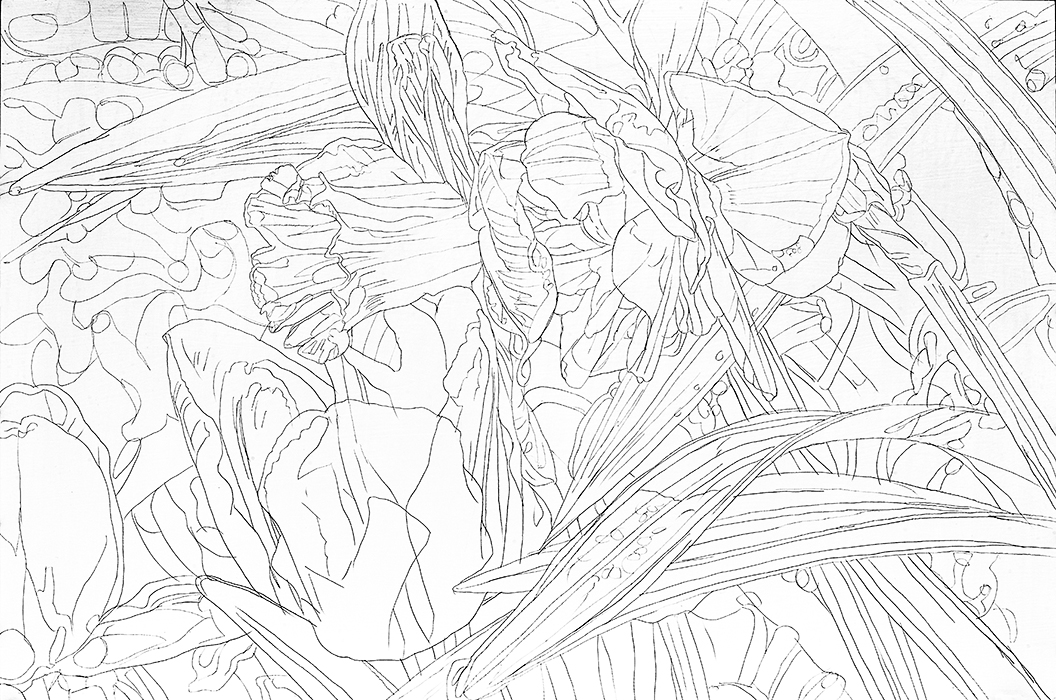 The drawing is transferred to the panel using a Cretacolor 430-08 Silverpoint Stylus via a BenQ TH670 DLP HD 1080p Digital Projector to draw key shapes and details directly onto the panel. This is the most important part of the process and may take up to three hours to complete. The drawing you see here has been adjusted to make it visible on this post. It appears much lighter on the primed panel.